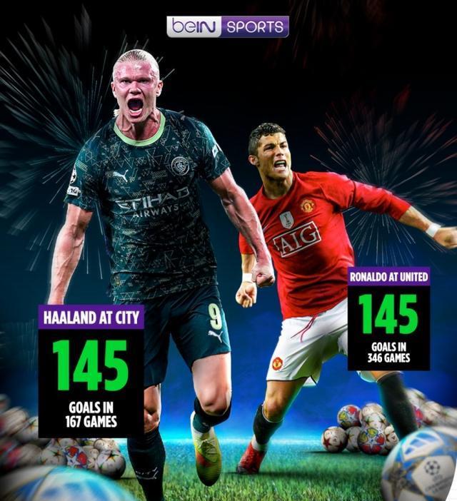 哈兰德如今已经在曼城打进的进球数(167场145球),已经追平了C罗在曼联时期的总进球数(346场145球),挪威人所用的场地尚不及金球先生的一半。